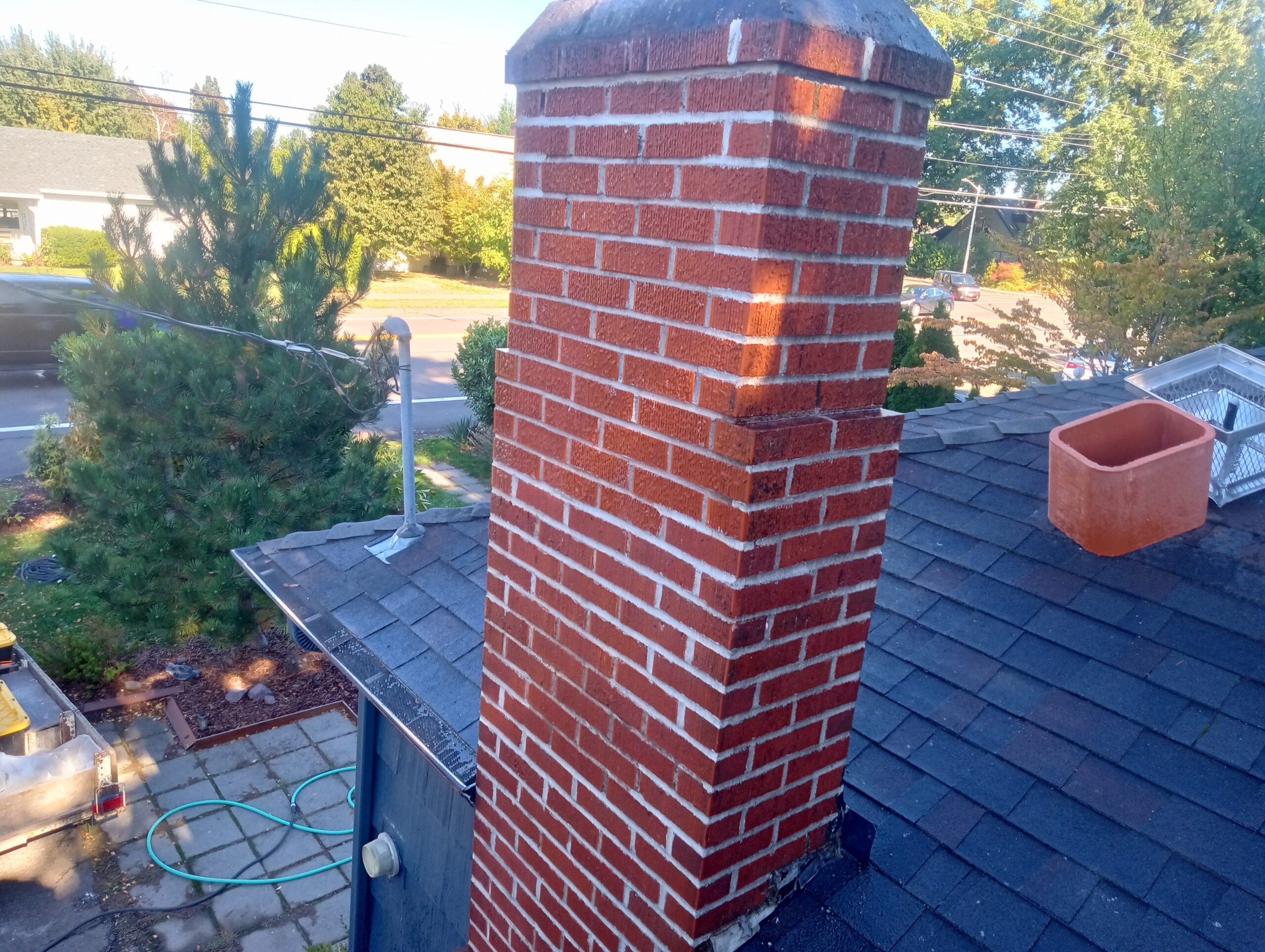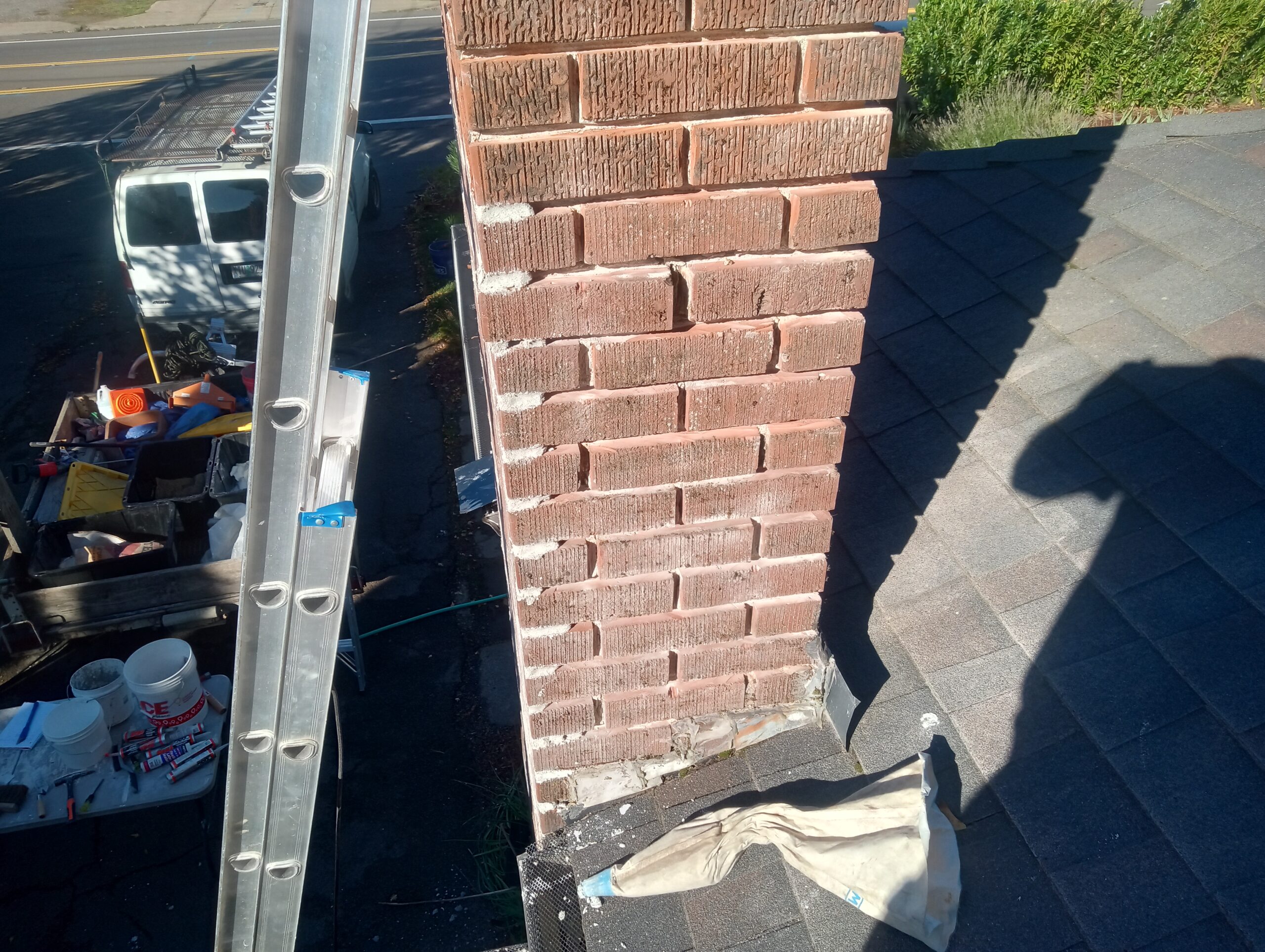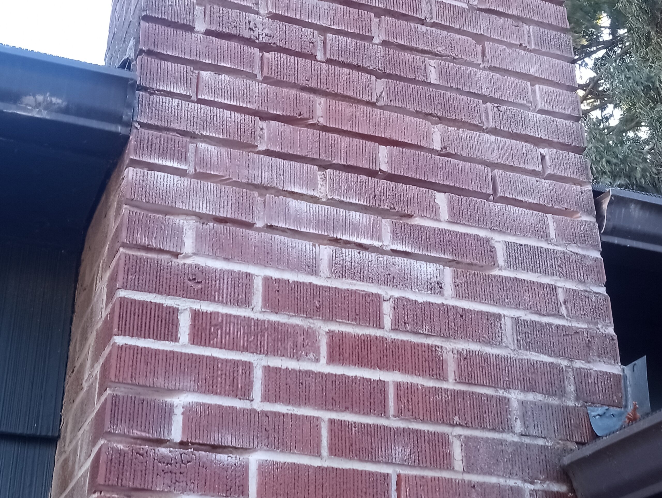 Mortar joints have been ground out as needed, then tuckpointed with a mortar consisting of sand, lime and white cement. The brightness of the new mortar joints will fade in time to match the original mortar joints.